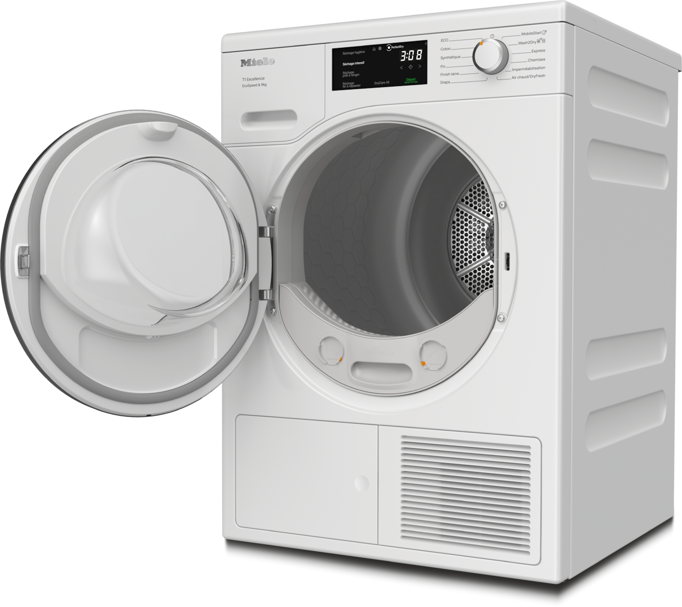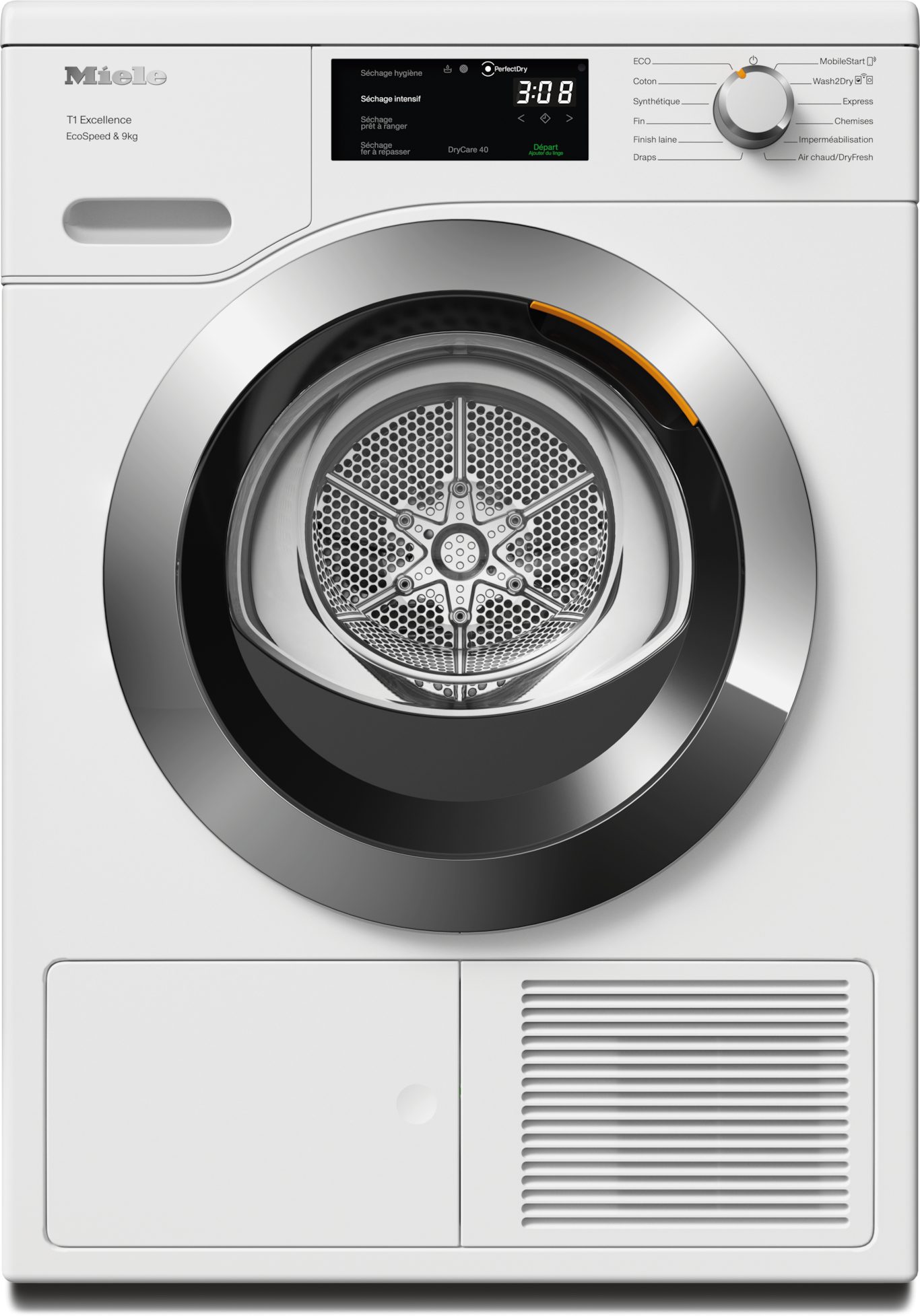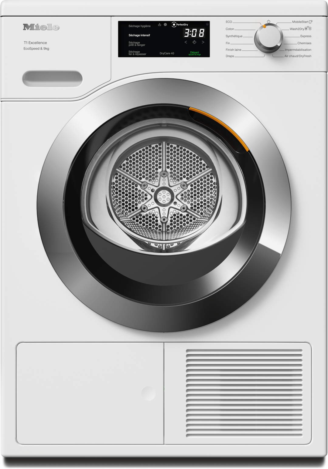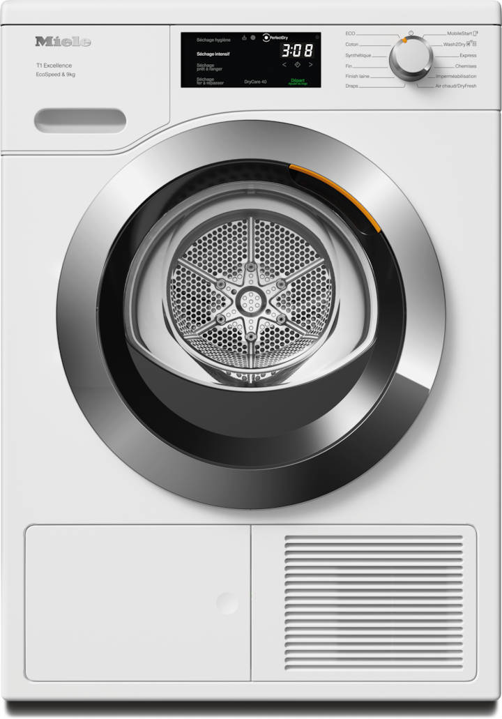 - 6.Gain de temps calculé par rapport aux sèche-linge Miele sans la fonction EcoSpeed avec la même charge et une efficacité énergétique similaire. Résultat testé avec le programme « Coton » à pleine charge.