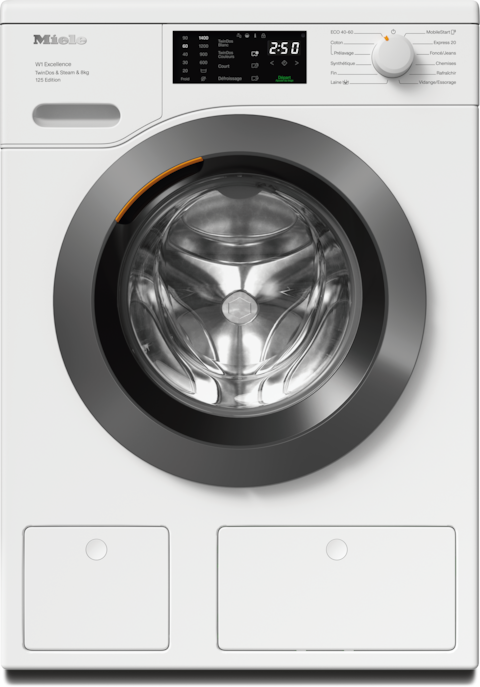 - 13.Lors du développement de la série de lave-linge W1/W2, Miele en a testé les modèles et les composants principaux avec 5000 charges (= 5 charges par semaine pendant 50 semaines par an) dans différents programmes. En savoir plus : miele.com/20years